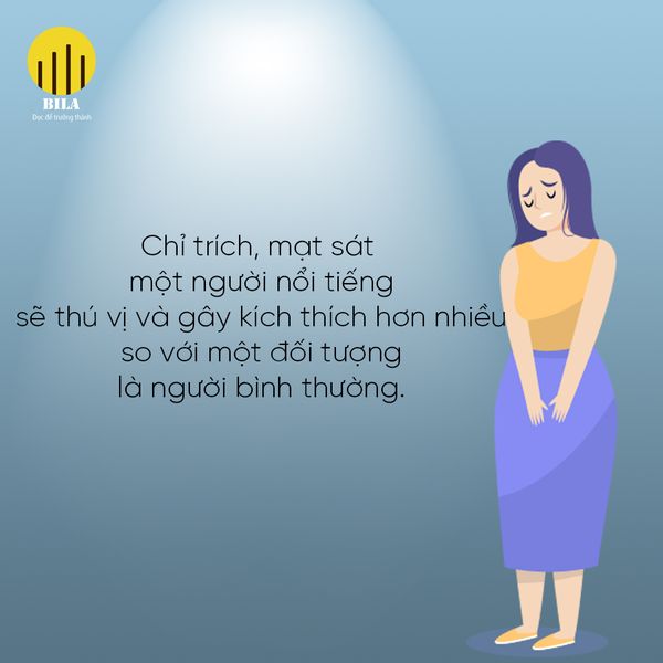 Sâu xa hơn, việc chỉ trích, mạt sát một người nổi tiếng sẽ thú vị và gây kích thích hơn nhiều so với một đối tượng là người bình thường. Nó xoa dịu ẩn ức sâu kín, thỏa mãn cái tôi cá nhân còn đầy những tạp niệm, tham-sân-si của chính ta. "Mình không bằng nó, không với được như nó thì chí ít cũng phải đè nó xuống cho bằng mình". Dần dần, suy nghĩ ấy tiêm nhiễm trong tâm trí ta cảm giác ảo tưởng hão về quyền lực, nhất là trong thời đại Internet làm bá chủ toàn cầu, thì những "anh hùng bàn phím" càng như cá gặp nước, lấy quyền tự do ngôn luận ra làm cái cớ để lộng ngôn, bao biện. Chính vì vậy, đằng sau ánh hào quang, nhất cử nhất động của những người nổi tiếng đều bị săm soi, dòm ngó và phán xét. Họ không dám tự do bày tỏ ý kiến, quan điểm một cách cá nhân; không dám thoải mái sống là chính mình với những khiếm khuyết, "vô thập toàn". Là một người bình thường, ta cũng đã luôn cảm thấy sợ hãi sự soi mói, đánh giá của người khác về khiếm khuyết của bản thân. Huống hồ là một người nổi tiếng, cuộc sống cá nhân của họ bị phơi bày, săm soi trước cả ngàn ống kính, thậm chí bản thân và gia đình còn bị vu oan, bôi nhọ nhân phẩm, liệu họ có thấy hạnh phúc, yên bình nổi hay không?