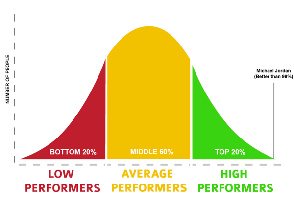 (Chú thích: Số người; Tốp cuối 20% - Năng lực yếu kém; Tốp giữa 60% - Năng lực trung bình; Tối cuối 20% - Năng lực xuất sắc; Michael Jordan (Giỏi hơn 99% còn lại)).