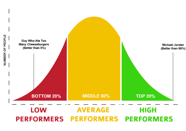(Chú thích: Số người; Tốp cuối 20% - Năng lực yếu kém; Tốp giữa 60% - Năng lực trung bình; Tối cuối 20% - Năng lực xuất sắc; Michael Jordan (Giỏi hơn 99% còn lại); Một gã nào đó đã nốc quá nhiều Cheeseburger (khá hơn tốp cuối 5%))